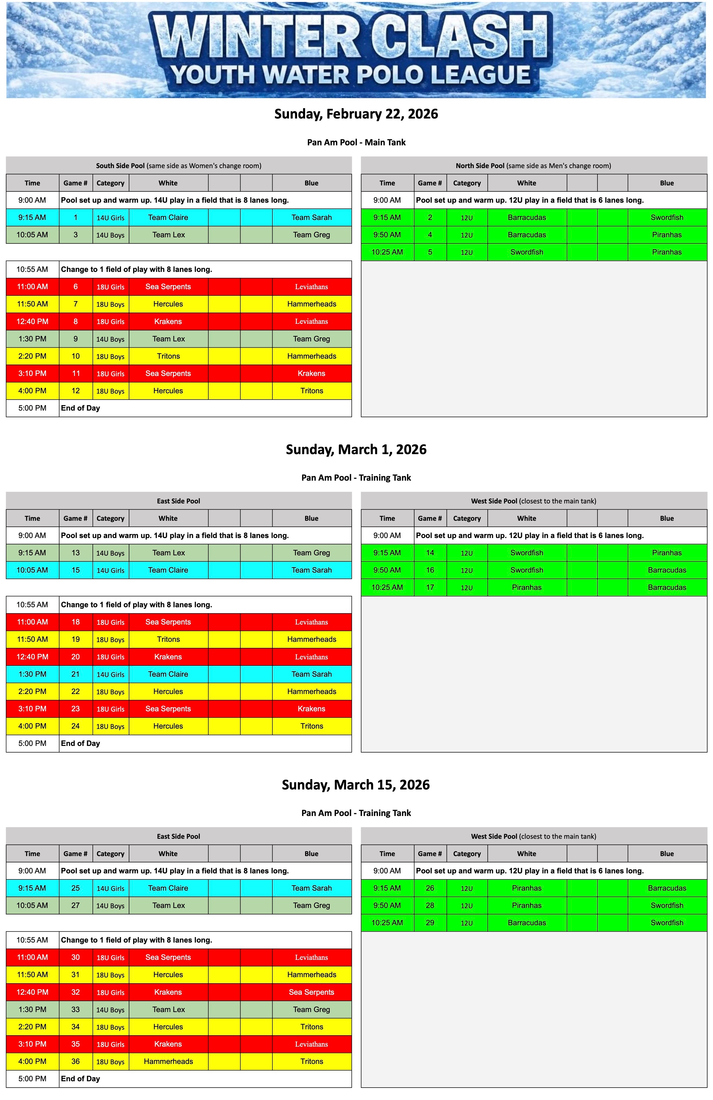 - Athletes please be on deck 30 minutes before your game